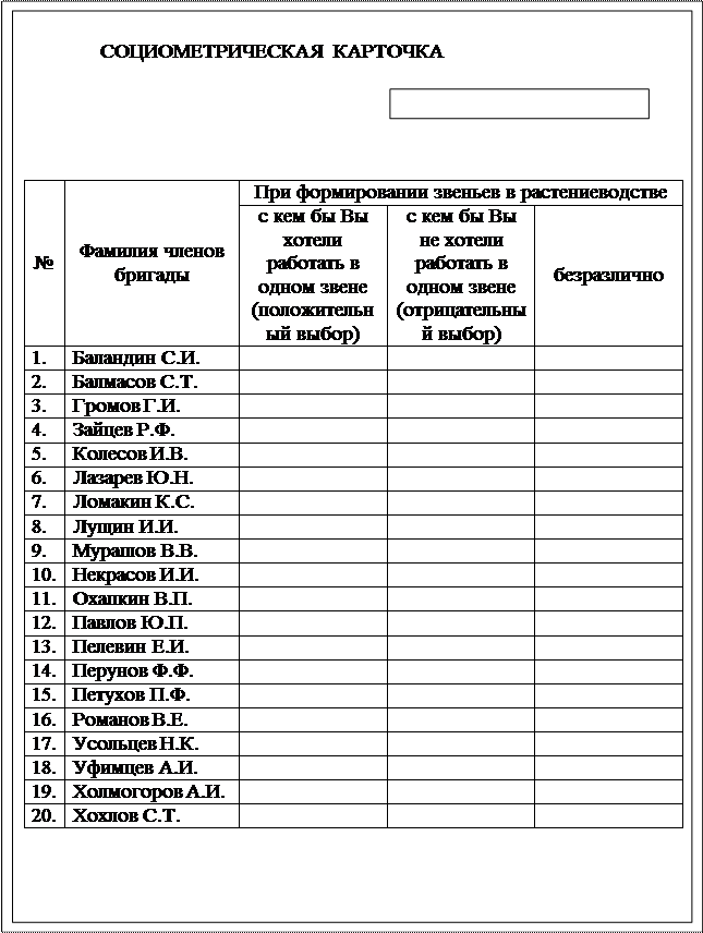 Для выявления звеньев в исследуемой группе по установленному критерию проводят социометрический опрос. При этом следует иметь в виду, что опрос можно проводить только в группах, члены которых знают друг друга и совместно работают не менее полугода. Для проведения опроса заготавливают специальные социометрические карточки, на которых записаны фамилии членов группы в алфавитном порядке (рис. 2).