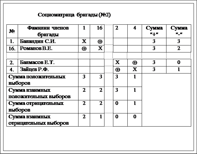 Условия занятия и исходные материалы. В ОАО «Победа» проводится реорганизация организационной структуры управления. Принято решение разукрупнить бригаду и создать психологически совместимые, стрессоустойчивые, самоуправляемые микроколлективы, где учтен человеческий фактор для обеспечения высокой производительности труда с численностью звеньев до четырех человек. В связи с этим исследовали бригаду и был проведен социометрический опрос по критерию «совместная работа» для определения звеньев. Результаты опроса представлены в таблице 2.