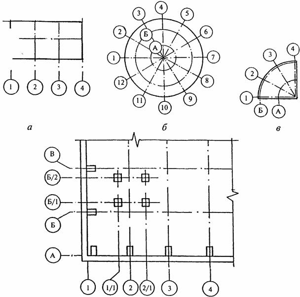 - Последовательность цифровых и буквенных обозначений координационных осей принимают по плану слева направо и снизу вверх (рисунок 3а) или как показано на рисунках 3 б, в.