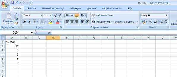 В ячейки в Microsoft Excel вносятся любые пять чисел.