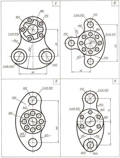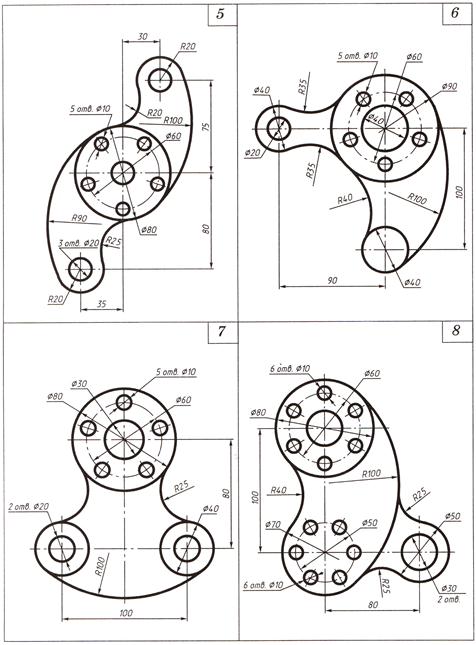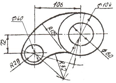 Пример выполнения листа показан на рисунке 5, условия заданий даны на рисунке.6. Необходимо сохранить в тонких линиях построения центров сопряжений и точек сопряжений.