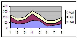 Также подчеркивают изменения во времени. Отображая сумму значений рядов, такая диаграмма наглядно показывает вклад каждого ряда.