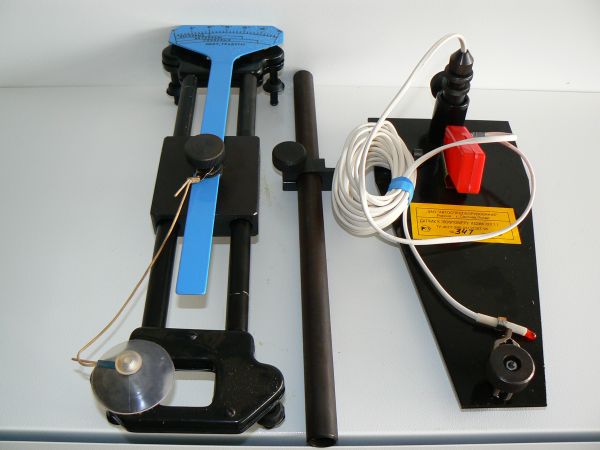 6 – обойма; 7 – резиновая нить; 8 – присос; 9 – фиксатор шкалы; 10 – стойка; 11 – ползун с фиксатором; 12 – датчик; 13 – блок питания с электрической лампочкой;