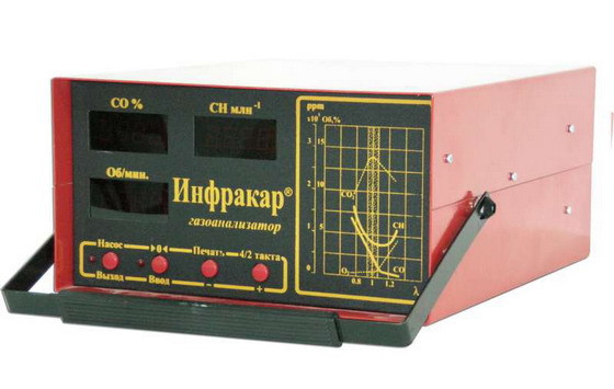 Газоанализатор ИНФРАКАР используется для измерения объемной доли оксида углерода (СО) и суммы углеводородов (СН), а также для измерения частоты вращения коленчатого вала автомобилей с бензиновыми двигателями.