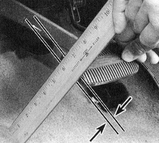 7.2.3. Произвести проверку свободного хода педали тормоза. Устанавливаем около педали линейку или рулетку (рис. 7). Нажимая на педаль рукой, опускаем ее вниз до тех пор, пока не почувствуем увеличение сопротивления движению педали. Для повышения точности замера операцию повторяем несколько раз. Свободный ход педали при неработающем двигателе должен составлять 3-5 мм. Увеличение рабочего хода педали тормоза и ее «мягкость» указывают на наличие воздуха в тормозной системе. Результаты замера заносим в табл. 2.