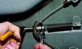 7.2.5. Проверка работоспособности стояночного тормоза автомобиля заключается в обеспечении удержания автомобиля на уклоне 23 % при перемещении рычага на 3-4 зубца сектора. Если требуется большее перемещение рычага или если автомобиль не затормаживается, необходимо отрегулировать стояночный тормоз, отпустив контргайку (рис. 9), и, вращая регулировочную гайку, натянуть трос, затянуть контргайку и проверить, остается ли автомобиль в заторможенном состоянии при перемещении рычага на 3-4 зубца.