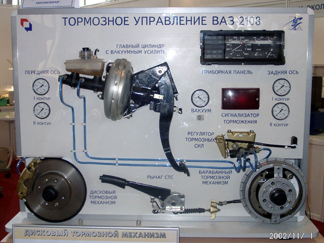 Набор элементов тормозного управления автомобиля устанавливается на вертикальной стойке и включает: главный тормозной цилиндр с вакуумным усилителем и педалью; регулятор тормозных сил с приводом; дисковый тормозной механизм переднего колеса; барабанный тормозной механизм заднего колеса; рычаг привода стояночной тормозной системы с уравнивателем и тросом; трубопроводы и шланги; блок сигнализирующей аппаратуры (приборная панель); задний фонарь автомобиля; электрические цепи.