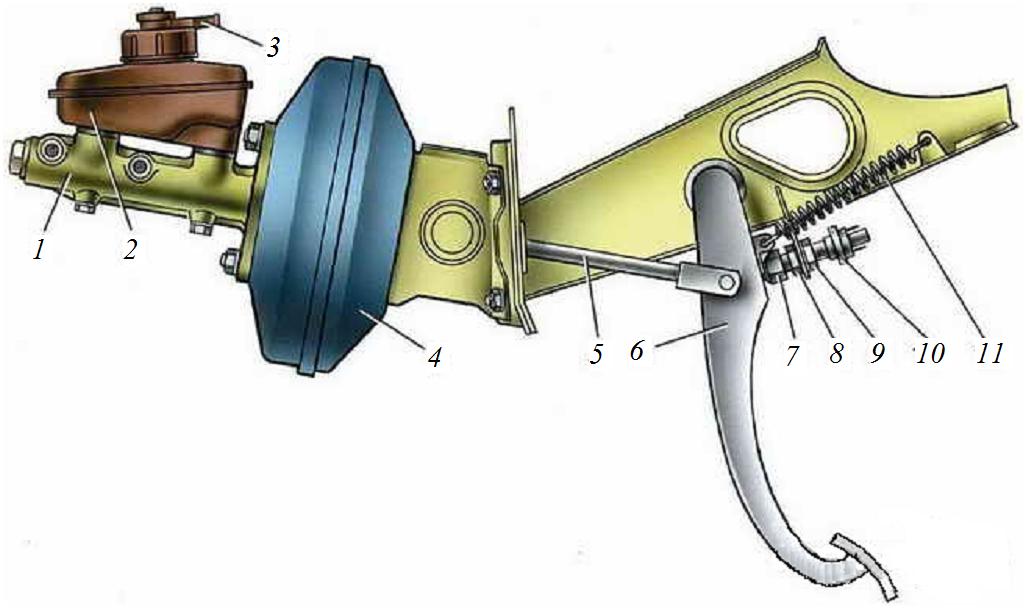 Рис. 8. Привод тормозов: 1 – главный цилиндр; 2 – бачок; 3 – датчик аварийного уровня жидкости; 4 – вакуумный усилитель; 5 – толкатель; 6 – педаль тормоза; 7 – буфер выключателя стоп-сигнала; 8, 9 – гайки крепления стоп-сигнала; 10 – выключатель стоп-сигнала; 11 – возвратная пружина педали
