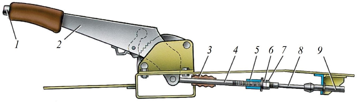 Рис. 9. Привод стояночной тормозной системы: 1 – кнопка фиксации рычага; 2 – рычаг привода стояночного тормоза; 3 – защитный чехол; 4 – тяга; 5 – уравнитель троса; 6 – регулировочная гайка; 7 – контргайка; 8 – трос; 9 – оболочка троса