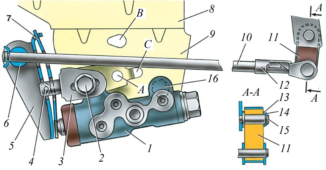 В случае неправильной регулировки привода ослабьте болты 16 и 2 крепления регулятора давления, вставьте в отверстия А и В штифты специального рычага и переместите кронштейн до обеспечения требуемого зазора. В этом положении затяните болты 16 и 2 крепления регулятора давления и, убедившись в правильности регулировки, соедините серьгу 11 с кронштейном рычага задней подвески.