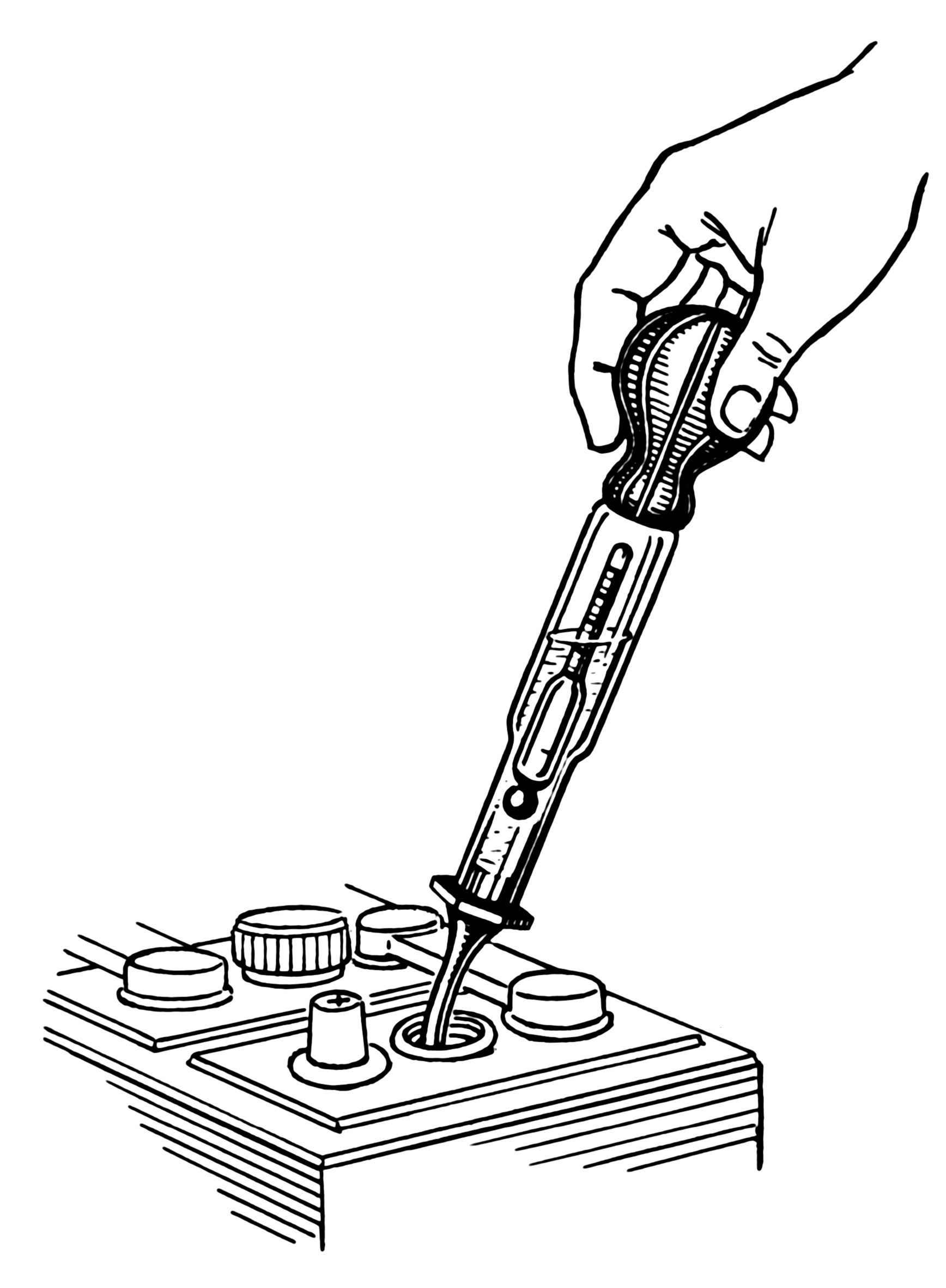 Уровень электролита проверяют через заливные отверстия с помощью стеклянной трубки с внутренним диаметром 5 мм. Трубку следует опустить в аккумулятор до упора в предохранительный щиток, затем плотно закрыть пальцем или грушей ее наружное отверстие и вынуть. Столбик электролита в трубке покажет его уровень в аккумуляторе.