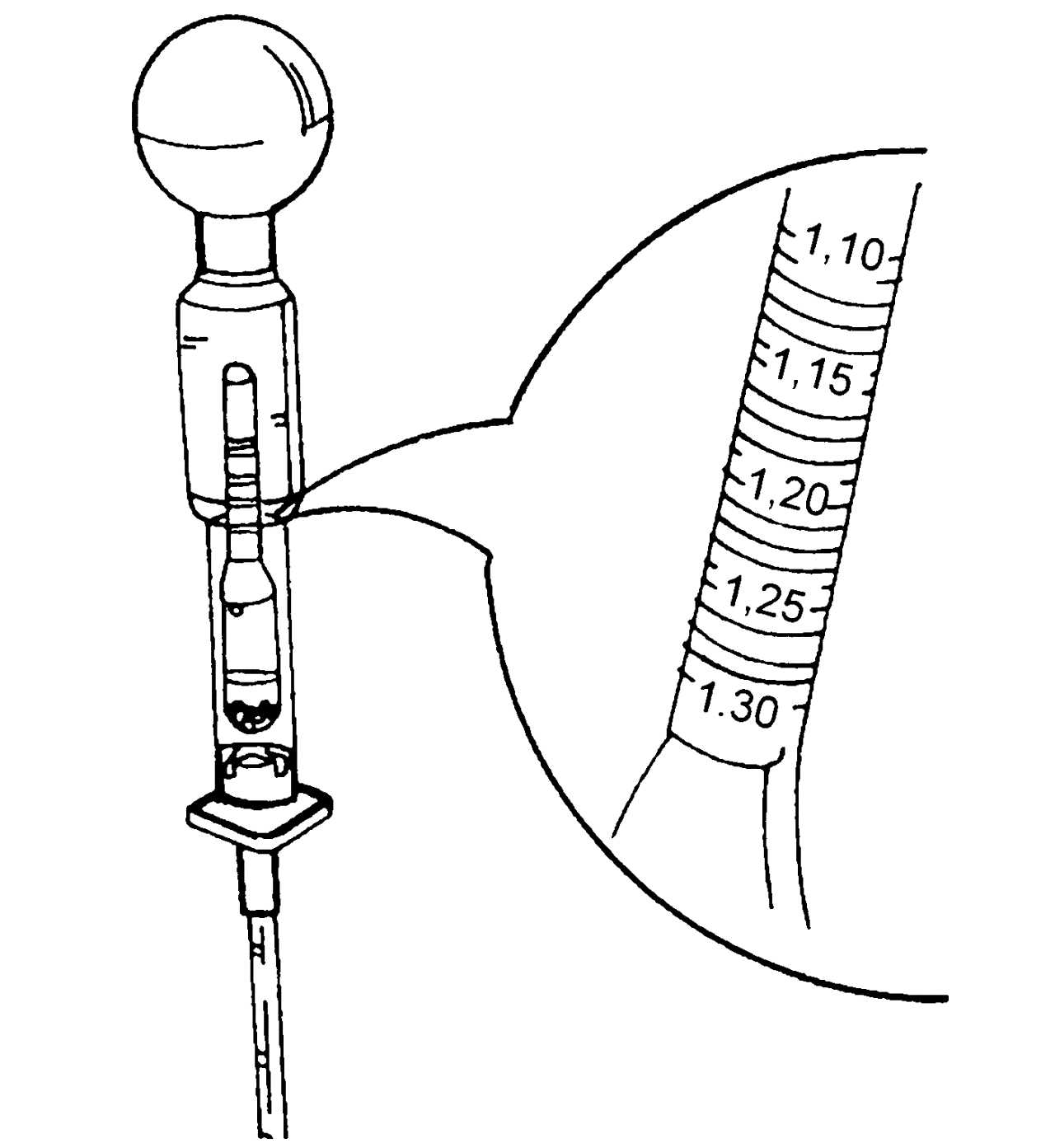 Перед началом работы необходимо собрать устройство для отбора жидкости, как показано на рис. 2. С помощью баллона через наконечник пробки в пипетку всасывается электролит или тосол в таком количестве, чтобы ареометр свободно плавал в вертикальном положении. Линия соприкосновения жидкости со стержнем ареометра соответствует плотности электролита. Измерения производить при температуре (20 ± 2) °С.