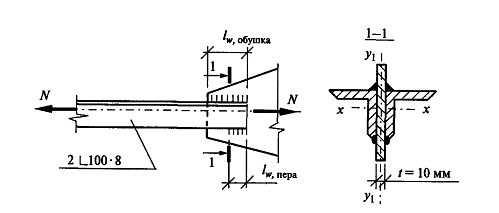 Следует учитывать, что эта длина шва требуется для прикрепления двух уголков. Распределяем швы между уголками по перу (30%), по обушку (70%).