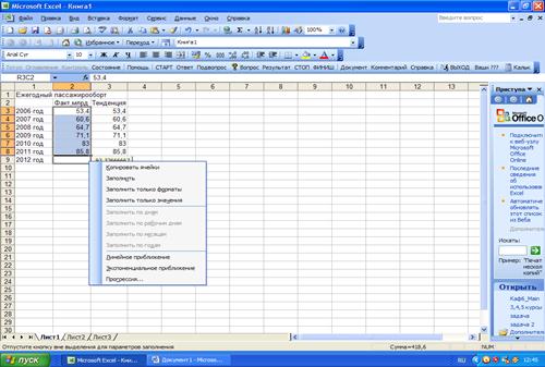 экстраполяция ряда данных - например, для анализа имеющихся фактических данных, оценки имеющейся тенденции их изменения и получения на этой основе краткосрочного прогноза на будущее. В Ехсеl имеется целый ряд возможностей для проведения подобного анализа данных.