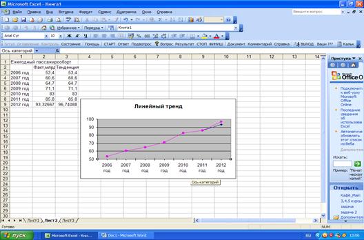 Пусть у нас имеются данные о пассажирообороте авиапредприятий Российской Федерации за шесть последних лет (с 2006 года по 2011 год), и мы хотели бы спрогнозировать динамику роста объема перевозок на 2012 год. Допустим, что наши данные представляют собой следующую таблицу: