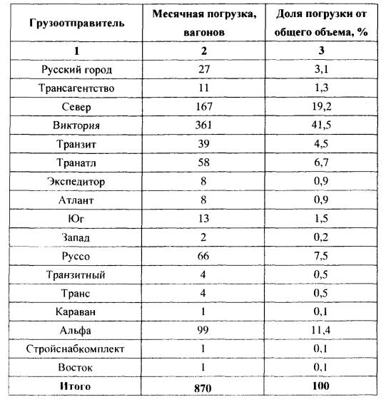 Данные месячной погрузки грузоотправителей станции представлены в табл. 1.1