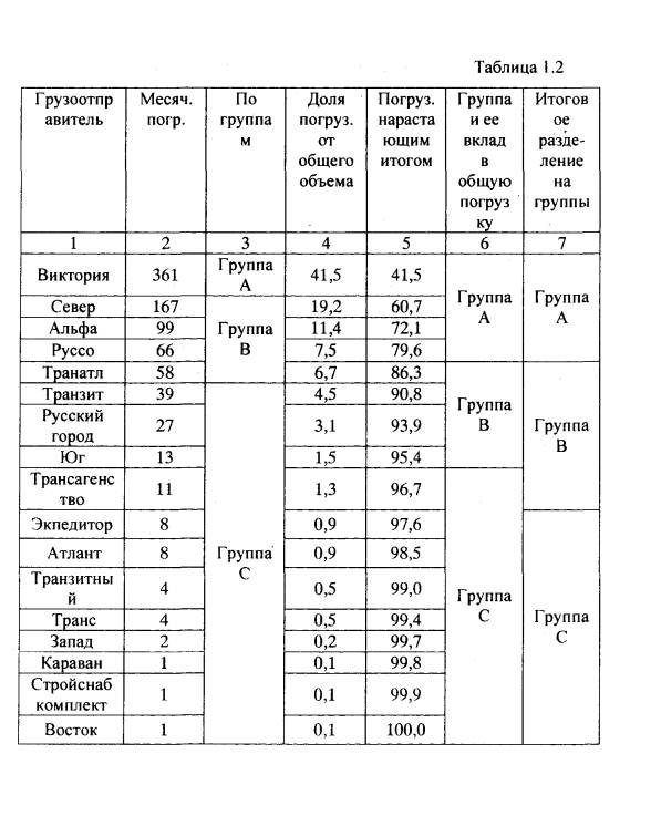 Для решения поставленной задачи составим табл. 1.2, в которой расположим всех грузоотправителей в порядке убывания их вклада в общую погрузку станции (первый и второй столбцы).