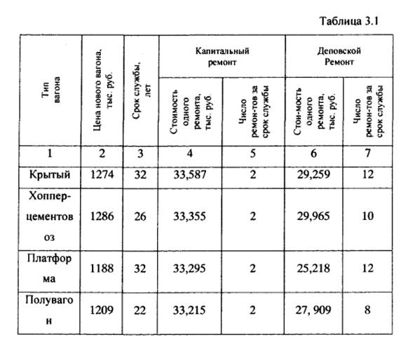- стоимость одного вагона тыс.руб.(данные о стоимости вагонов приведены в табл.3.1.).