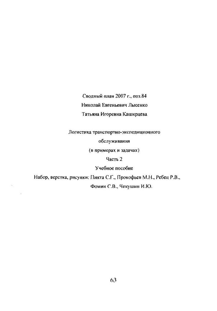13. Лысенко Н.Е., Каширцева Т.И., Лахметкина Н.Ю. Логистика транспортно-экспедиционного обслуживания (в примерах и задачах) часть 1, учебное пособие, МИИТ, М:2005-50 с.