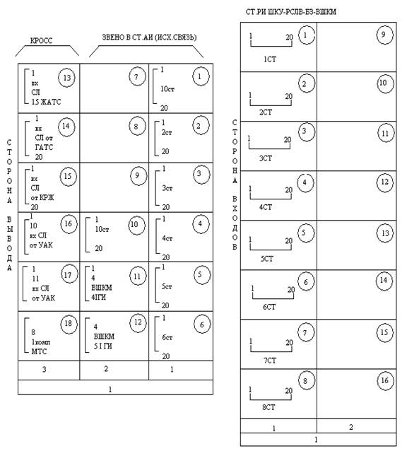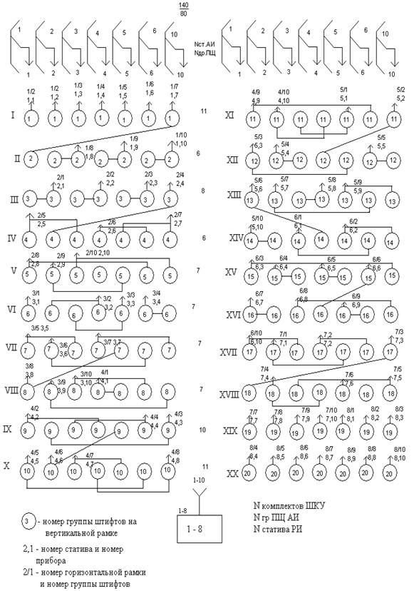 На схеме приняты следующие условные обозначения: цифра в окружности означает номер индивидуального выхода от подгрупп, что соответствует номеру группы штифтов на вертикальной рамке ПЩ. Цифра до запятой – номер статива РИ, после запятой номер ШКУ на данном стативе, что соответствует номеру входа. В числителе указывается номер горизонтальной рамки ПЩ, в знаменателе – номер группы штифта этой рамки, который должен соответствовать номеру прибора.