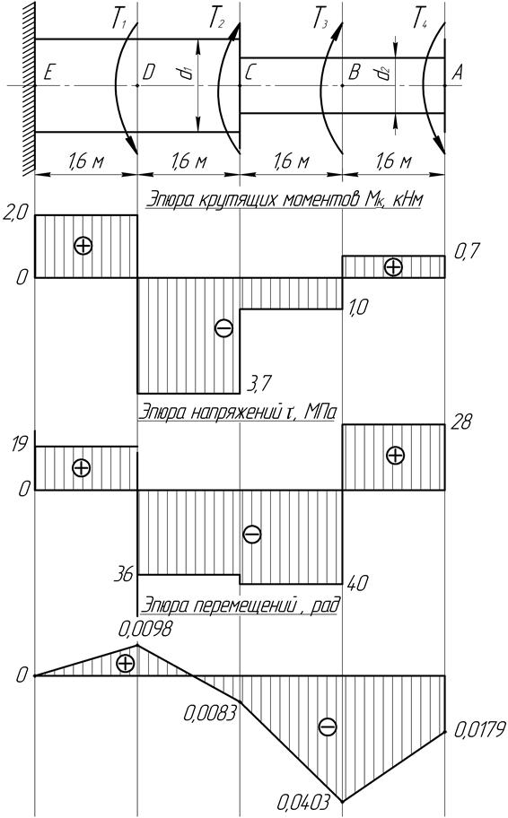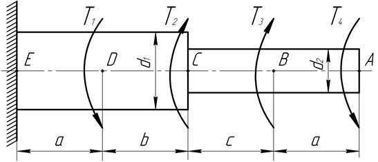 К стальному ступенчатому валу, имеющему сплошное круглое сечение, приложены четыре внешних закручивающих момента (Т1, Т2, Т3 и Т4), левый конец вала жестко закреплен в опоре, а правый конец – свободен и его торец имеет угловые перемещения относительно левого конца.