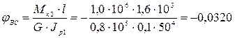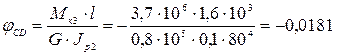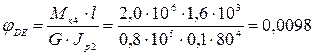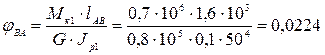 Абсолютные углы закручивания сечений вала, относительно жестко заделанного левого конца вала (сечение Е).
