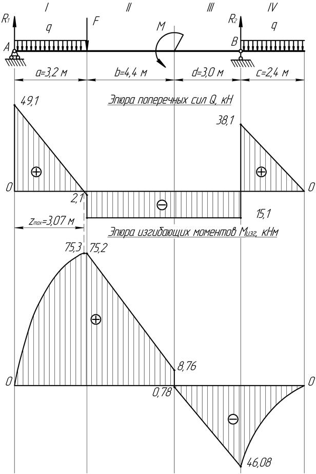 Из построенных эпюр (рис. 4.6) видно, что опасным является сечение, расположенное на 3,07 м от левого конца балки с