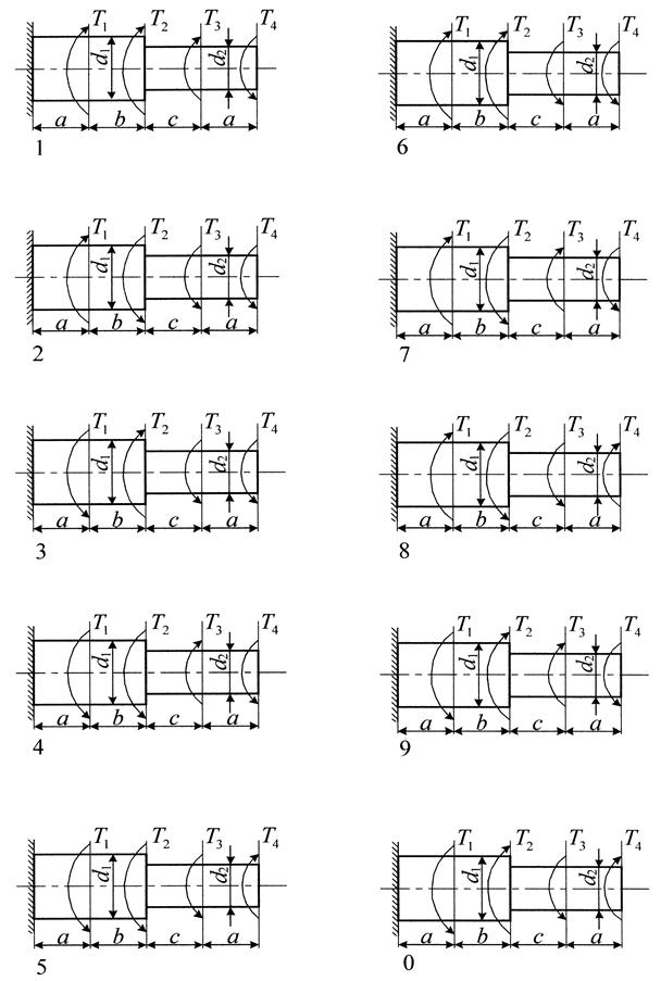 | Вариант задания (предпоследняя цифра шифра) | Расстояния, м | Моменты, кНм | [τ], МПа | ||||||