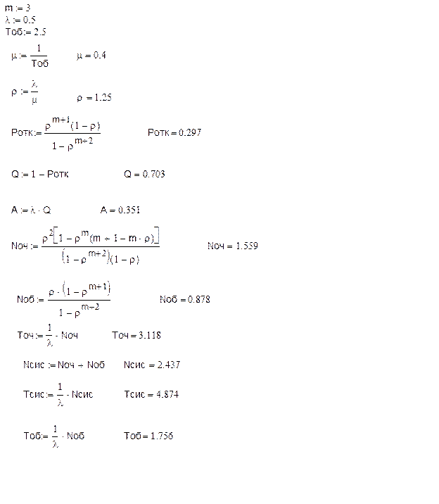 На стоянке обслуживается 3 машины с интенсивностью потока 0,5 и средним временем обслуживания 2,5 минуты. Определить все показатели системы.