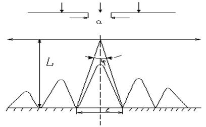 Решение. Центральный максимум интенсивности света занимает область между ближайшими от него справа и слева минимумами интенсивности. Поэтому ширину центрального максимума интенсивности примем равной расстоянию между этими двумя минимуме интенсивности (см. рис.).