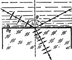 Задача 20. Пучок естественного света падает на полированную поверхность стекленной пластины, погруженной в жидкость. Отраженный от пластины пучок света составляет угол j = 97° с падающим пучком (см. рис.) Определить показатель преломления n1 жидкости, если отраженный свет полностью поляризован.