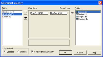 4. Двойным щелчком мыши выберите в поле Fields: NomBrig, а в поле Table: Brigada.db. С помощью черных стрелочек установите нужную связь между атрибуами NomBrig таблиц Brigada.db и Cootvet.db.