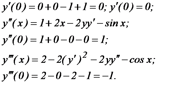 у΄΄΄(0), …, можно данное уравнение последовательно дифференцировать по переменной х и затем вычислить значения производных при х=0.