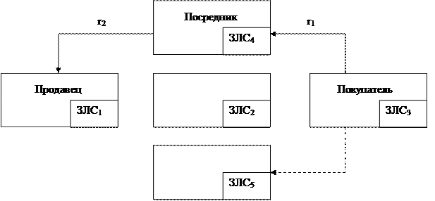 Логистические цепи в этой схеме, ориентированные по информационным и финансовым потокам, связанным с материальным, в принципе отличаются от цепи, представленной на рисунке 1.1. Предположим, что заказ покупателя на товар поступает продавцу через торгового (информационного) посредника, а расчеты фирмы – производителя за услуги логистических посредников и оплата товара производится через банк. При построении логистической цепи необходимо учесть появление новых звеньев. Кроме того, следует показать взаимосвязь звеньев по финансовым потокам, исходя из предположения, что логистические партнёры обслуживаются одним банком.