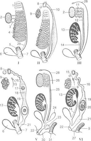 I(самец) и II (самка) – акуловые и амфибии; III(самец) и IV (самка) – рептилии и птицы; V (самец) и VI (самка) – млекопитающие; 1–пронефрос (предпочка); 2–семенник; 3–семявыносящий проток; 4–мезонефрос (первичная почка); 5–задняя кишка; 6–мочевой пузырь; 7–клоака; 8–воронка; 9–яичник; 10–мюллеров канал; 11–придаток семенника (остаток передней части мезонефроса); 12–семяпровод; 13–метанефрос (вторичная почка); 14–вторичный мочеточник; 15–рудимент мезонефроса; 16–яйцевод; 17–яйцеклетка; 18–белок, выделяемый железами стенки яйцевода; 19–матка; 20–зародыш в матке; 21–влагалище; 22–половой синус; 23–предстательные железы; 24–семенной пузырек: 25–семяпровод; 26–придаток семенника; 27–промежность; 28–рудимент мюллерова канала; 29–вольфов канал; 30–промежность; 31–анальное отверстие.