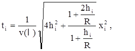 Вычислить годограф сейсмической волны, отраженной от криволинейной вогнутой границы, заданной данными xi, yi, hi и R при определенной скорости Vp(l) (где l – вариант) по формуле (источник волны находится непосредственно под поверхностью земли):