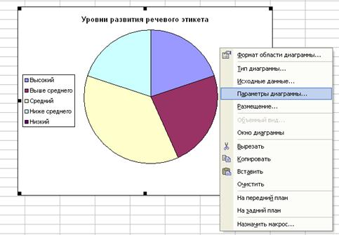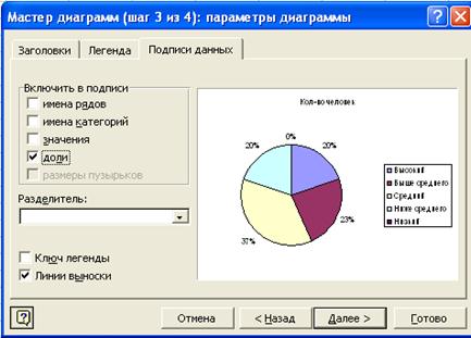 на панели инструментов и выбираем тип диаграммы. Следующий шаг выбирает диапазон данных, затем задаются параметры диаграммы (подписи данных, название диаграммы, расположение легенды):