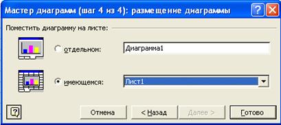 Диаграмму можно размещать на имеющемся листе, то есть рядом с таблицей, или на отдельном:
