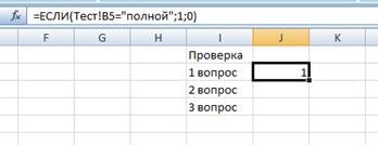На листе Результат в правой части сделайте проверку правильности ответов с помощью функции ЕСЛИ. Выделите ячейку для проверки ответа на 1 вопрос, в Формулы выберите логическую функцию ЕСЛИ. В логическом выражении участвует ячейка с листа Тест (ее нужно выбрать мышкой):