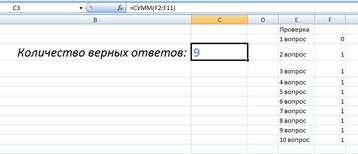 9. Примерно по центру листа Результат напишите «Количество верных ответов:» и с помощью функции СУММ посчитайте общее кол-во верных ответов: