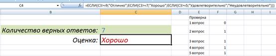 10. Задайте критерии оценки и с помощью вложенных функций если выведите результирующую оценку, например: =ЕСЛИ(C3>=9;"Отлично";ЕСЛИ(C3>=7;"Хорошо";ЕСЛИ(C3>=5;"Удовлетворительно";"Неудовлетворительно")))