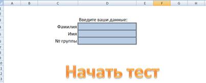 12. Оформите лист Начало. Определите и оформите стилем ячейки для ввода данных отвечающего. (Примечение. Если Вы создаете тест для учеников школы, то еобходимо сделать поле для ввода номера класса, аналогично номеру группы для студентов). Добавьте надпись WordArt и гиперссылку для перехода на лист Тест ( ПКМ Гиперссылка, связать с местом в документе, лист Тест):