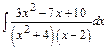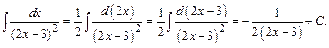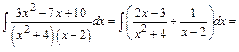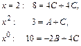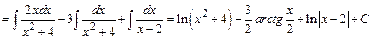 Составим систему трех уравнений с тремя неизвестными. Одно уравнение получим, полагая х= 2 (корень знаменателя подынтегральной функции). Два других получим, приравнивая коэффициенты при одинаковых степенях х в обеих частях тождества, например