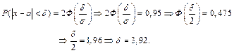 Пример 7. Среднее квадратическое отклонение случайной величины, распределенной по нормальному закону, равно 2; М (x)=16. Найти границы, в которых с вероятностью 0,95 следует ожидать значения случайной величины.