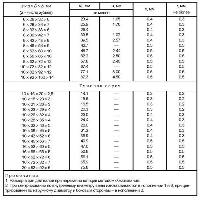 Таблица 5 Номинальные размеры основных параметров шлицевых соединений с прямобочным профилем зубьев.
