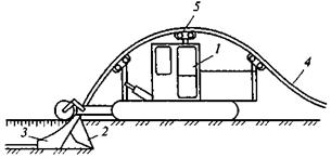 1 — гусеничный тягач; 2 — режущий нож; 3 — щелезасыпщик; 4 — трубная плеть;