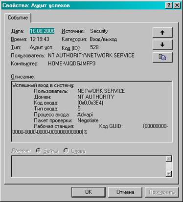 В событиях 540 следует обратить внимание на поле Пользователь. Обычная пользовательская учетная запись свидетельствует, что пользователь зарегистрировался в системе через сеть; на эти события следует обратить внимание. Запись SYSTEM, указывающая, что одна системная служба устанавливает соединение с другой службой на той же машине. Имя компьютера с символом $ означает, что системная служба на удаленной машине устанавливает связь с системными службами на данном компьютере. Например, рабочая станция Windows 2000 Professional немедленно после запуска связывается с контроллером DC, чтобы получить информацию из AD и обратиться к другим доменным службам.