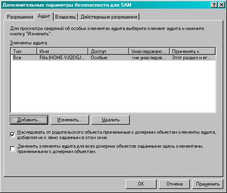 Аудит представляет собой процесс, который операционные системы Windows NT/2000/XP используют для обнаружения и регистрации событий, связанных с системой безопасности. К таким событиям относятся, например, попытки создания или удаления системных объектов, а также попытки получения доступа к таким объектам. Обратите внимание, что в объектно-ориентированных системах в качестве объекта может рассматриваться все что угодно – файлы, папки, ключи реестра и т. д. Все эти и другие подобные им события регистрируются в файле, известном под названием «Журнал безопасности (security log)». По умолчанию аудит в системе не активизирован. Таким образом, если вам необходимо контролировать события, относящиеся к безопасности, то требуется его активизировать. После того как это будет сделано, операционная система начинает регистрировать события, связанные с системой безопасности, и зарегистрированные данные можно просмотреть с помощью специального средства просмотра – утилиты Просмотр событий (Event Viewer). При установке аудита можно указать типы событий, подлежащих регистрации в журнале безопасности, и операционная система будет создавать в журнале безопасности запись о событии каждый раз, когда событие указанного типа происходит в системе. Запись в журнале безопасности содержит описание события, имя пользователя, который выполнил соответствующие этому событию действия, а также дату и время события. Аудит можно установить как на успешные, так и на неудачные попытки выполнения операций, и журнал безопасности, соответственно, будет отображать имена пользователей, совершивших успешные попытки, и имена пользователей, пытавшихся выполнить запрещенные действия.