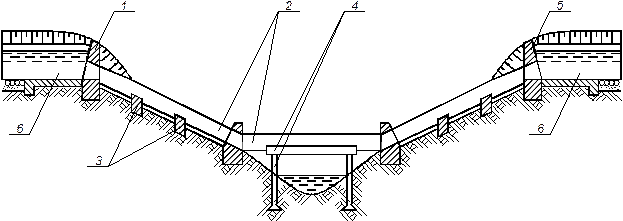 1.- входной оголовок, 2.- напорные трубопроводы, 3.- анкерные опоры, 4.- промежуточные опоры с пролетным строением (мостом), 5.- выходной оголовок, 6.- сопряженные участки с каналом.