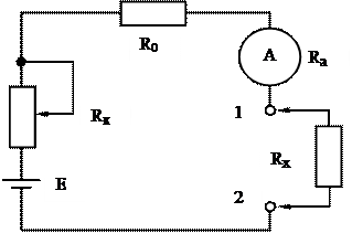 Для измерения сопротивления Rx используется магнитоэлектрический омметр, имеющий последовательную схему включения. Напряжение источника